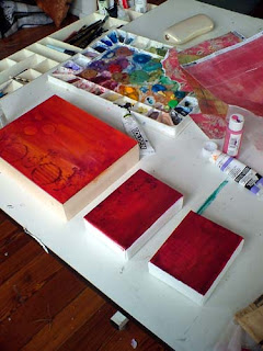 I also have this huge Big Diva mermaid painting that I'm working on. She is acrylic on canvas. Yes, I still have boxes to unpack, as you can see in the picture. I think there are 4 left...and I just can't find the time to unpack them! I hate moving. So, I just keep fishing things out of them as I need them.I also have 3 other smaller canvas that I started the backgrounds for. Actually, there were 4 in the beginning, but one became the cat painting. I like to start out with several smaller canvas and work on the backgrounds. One of the canvas usually starts developing faster than the rest, so I put the others to the side. I know a lot of artists work on several paintings at once, but I'm not very good at it. As a child, I always ate one thing at a time on my dinner plate...kinda the same concept.